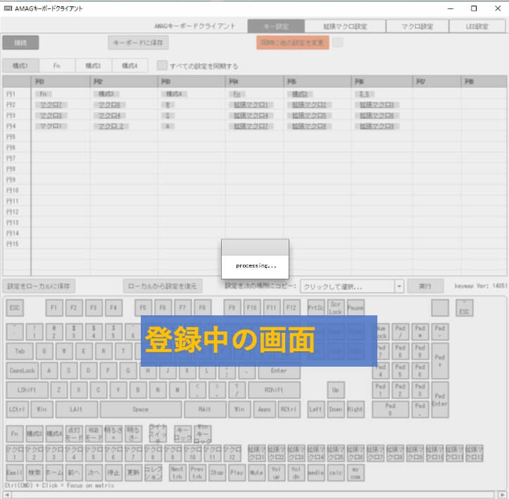 たとえば、マクロ1を登録作業の途中、キー反映中の画面で止まってしまいます。